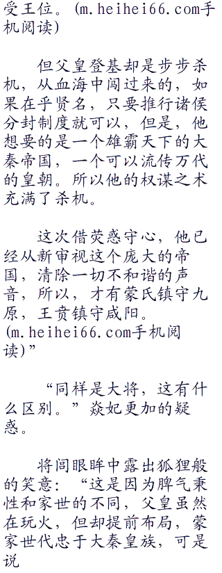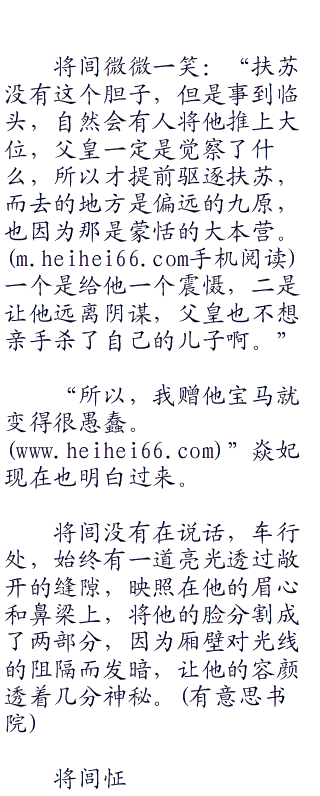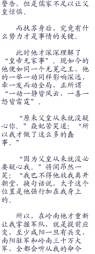 焱妃轻轻梳笼他的长发,幽幽道:“我现在也不明白究竟做错了什么。”话语之中带着一点点的小委屈,不管是祥瑞降世还是送扶苏赠宝马,一切都完美无瑕无可挑剔。