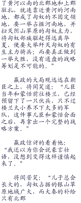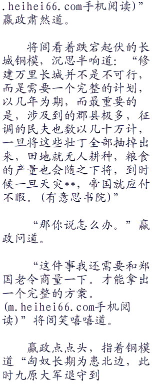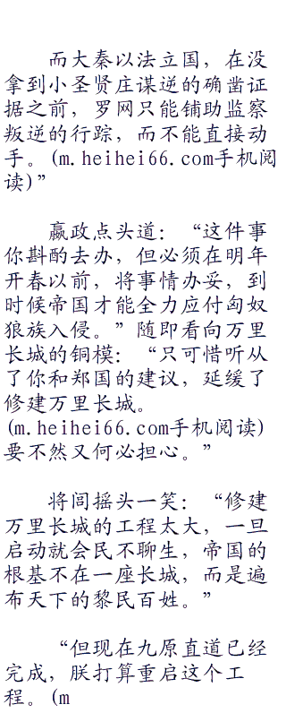匈奴狼族一直是中原腹地的心腹大患,而蜃船也关系到帝国的安危,能不能剿灭海岛上的六国余孽,就看这艘大船和新组建的舰队是不是能够纵横海疆。从咸阳到各郡的直道已经彻底完工,修建万里长城已经提上了日程。