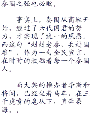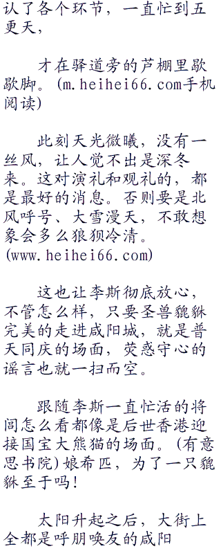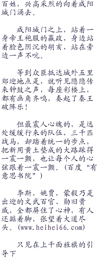 为了消除荧惑守心在大秦臣民心中形成的阴霾,李斯是下了血本的,从咸阳城到老母宫百里的距离,每隔十里就打起一座彩楼,彩楼两边,三步一岗,五步一哨,禁军士卒们皆衣甲鲜明,军官还披着猩红的披风,更显得威武不凡。