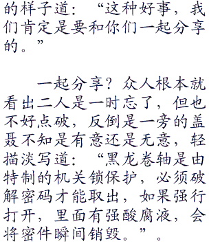 “结果就是,我也不知道这匹宝藏的下落。”张良身体扭转,瞬移之间脱离了赤练蛇王的攻击范围:“不过,当年的人虽然全死了,但毕竟还有后人留下来,据我推测,知道这个秘密的还有两个人。”