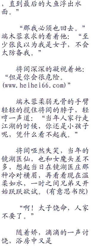 水面上的花片在轻轻的起伏荡漾着,惊涛骇浪彻底平息,但是端木蓉心中的风浪却没有停息,她把艳丽的脸蛋轻轻的搭在将闾的肩膀上,将闾能够听见她心脏发出比平常急骤几倍的跳动。