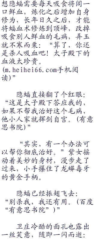 隐蝠修炼的是苗疆蝠血术,这是一种失传多年,诡异绝伦的杀人术,修炼的时候需要将蝠血注入体内运转到全身经脉各处,每杀一个人,喝干全身血液,功力就会精进一分,但是一天不喝血,就会衰老一份。