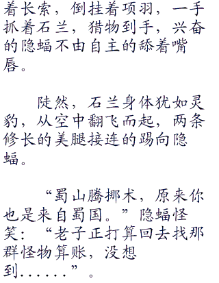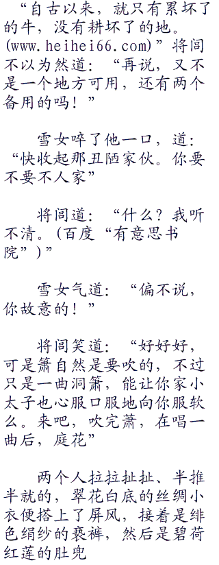雪女有些惧怕的央求道:“你可不能蛮牛似得没完,我一个人可不是你的对手。”