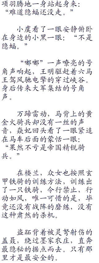 一番惊心动魄的挣扎,二人一兽终于安全的攀上悬崖,项羽心有余悸的看着飞走的隐蝠,不由自主的送了口气:“这个怪物终于走了。”