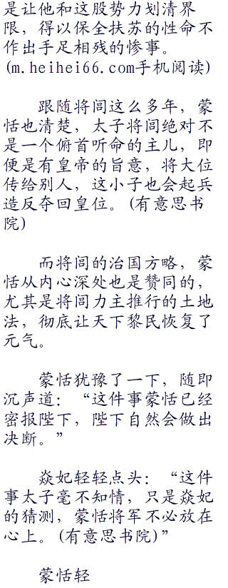 “蒙恬将军,你和太子交情莫逆,蒙毅兄长是太子的结拜兄弟。”焱妃看着天空中的繁星:“我想知道,皇长子扶苏的隐藏势力。”