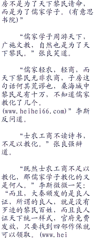 “帝国依法治国,本来无可厚非,但是突然之间颁布良人证和路引,限制黎民通行天下,儒家学子秉承圣人传统,周游天下增长见闻,良人证和路引却让儒家学子寸步难行,不知道大人是否清楚这件事。”张良正色道。