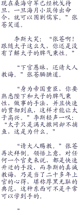 “流传千年,尚未破解的秘密,原来如此”苍龙七宿是什么,李斯比张良还清楚,太子将闾已经屡次的破解苍龙七宿的秘密,并且从中得到无数的宝物。但是,李斯想知道的却是韩非掌握的苍龙七宿的秘密。
