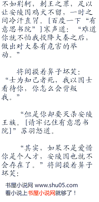 苏羽的武功修为将闾没放在眼里,但是他的镇定功夫和胆量却值得钦佩,只不过将闾的条件太苛刻了,不管怎么样安陵王族都得死。