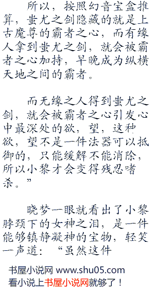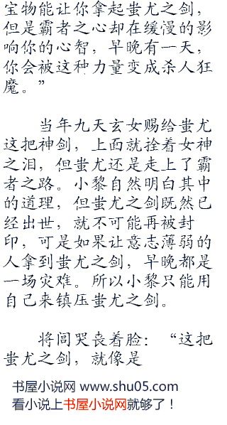 晓梦无语,小黎却是忧心忡忡,蚩尤之剑是九天玄女用陨落星辰为勇士蚩尤所造。上古时期黄帝带领士兵追杀蚩尤,忽然天昏地黑,浓雾迷漫,狂风大作,雷电交加,天上下起暴雨,黄帝的兵士无法继续追赶。就是因为蚩尤手持这把绝世神剑,施法请来了“风神”和~“雨神”助战。