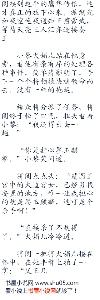 “其实这样才符合你我之间的利益。”将闾很认真的看着她:“我不用担心你逃跑,你也不用担心我杀你,至少对一个不穿衣服的女人,我还下不去手。”