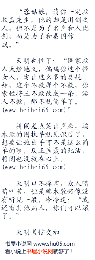 庸医啊!庸医!将闾暗自发誓,将来受伤在重,也绝对不找端木蓉疗伤。