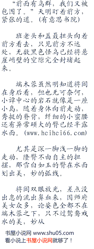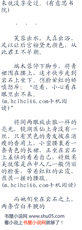端木蓉听见衣服,这才明白过来,手忙脚乱的从潭水中抓起青裙,躲在水中穿上。