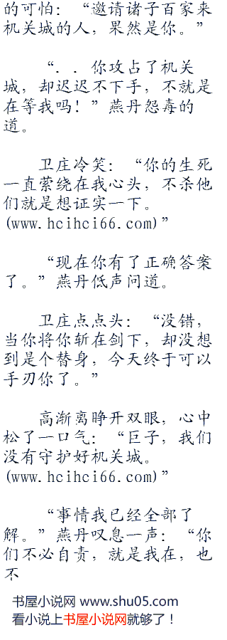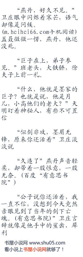 燕丹叹了口气,伸手摘下脸上的斗篷,昔日英俊的脸上布满了伤疤,都是当年和宋如意千辛万苦从辽境逃回燕国弄的:“卫庄,你还不明白公子将闾的阴谋。”
