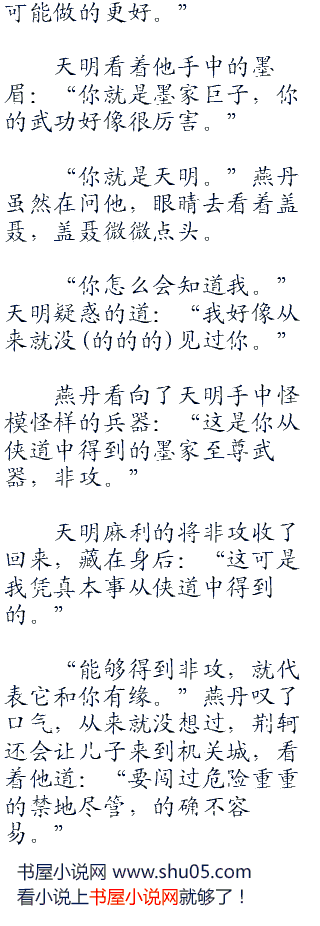 燕丹抓住天明的手:“我这一生亏欠你父子良多,现在没有什么回报你,只能将这一身真气送给你,免去你几十年的苦修,从今天起,你就是墨家巨子,希望你善待墨家。”