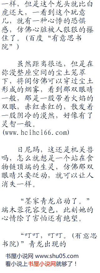 端木蓉蹙着翠眉:“结绳记事,能够传递的信息很少,祖师在这两条绳子生面,分别记载了两件事,一个是这里另有逃生的通道,而另一个想要降服机关青龙,必须找到墨者之_心。”
