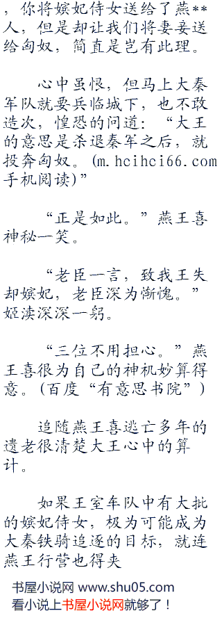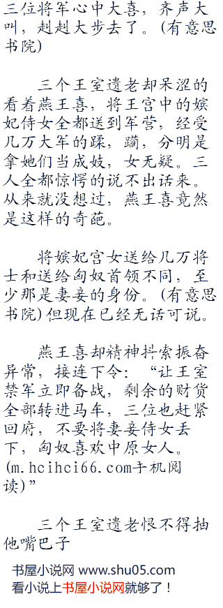 燕王喜咬牙道:“本王决定将所有嫔妃侍女全都赠送给将士,三位将军马上去整军备战,今天晚上,女人送到军营。”