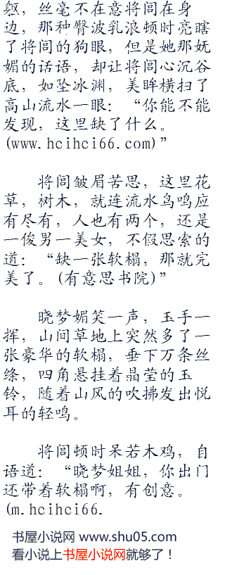 此时将闾和晓梦二人正坐在一座不高的小山坡上,一株不知名的大树,茂盛的枝桠如伞遮蔽顶上的天空,两人之间多了一张案几,但座位却变成了洁白如于、温润的山石,空气中弥漫着清新的空气,漂浮的树叶气息让将闾一下子就迷糊了。