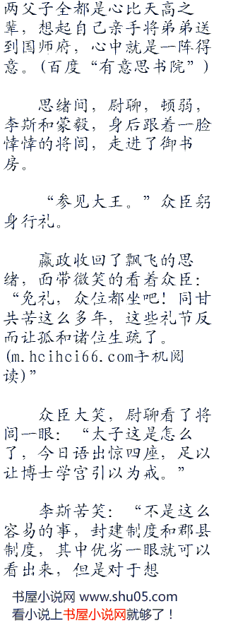 即便是回到御书房,嬴政依然回味着将闾那首诗词,惜三皇五帝,略输文采;夏商周三朝,稍逊风骚。背负着双手,看着巍峨的咸阳宫,思绪已经飘落在锦绣山河之上,敢自比三皇五帝,夏商周三朝天子,恐怕也唯有自己一人了。