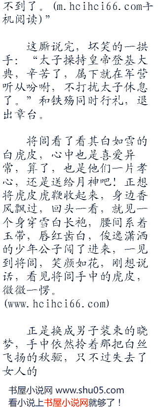 铁殇嘻嘻一笑:“不管是在咸阳宫,还是在长公主门下,属下都是太子的人,这次从燕境归来,那里穷山恶水的,土地贫瘠,没有给太子带什么好东西,这次从襄平归来,幸好猎到一头白虎,虎肉属下们吃了,但是全体将士,让属下将虎皮送了过来。还有一匹汗血宝马,是马群中挑出来的,属下打算献给长公主。”