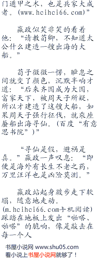 “起来吧”嬴政冷眸扫了他一眼:“朕的意思你还不明白,或者是跟朕装糊涂,太公宝库中所藏的是什么,朕早已心知肚明,不过是一具蜃船而已,但是当年出海之人不死,山东六国流浪贵族就不会死心,朕要的是一劳永逸,万世基业!”