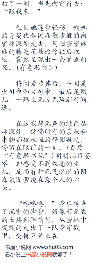 众人快步疾奔,好像走进了一座原始森林,一株株高不见顶的古树尽显时代的沧桑,浓绿的树冠就像是一把遮天的大伞,绿的灌木、绿的藤蔓、绿的枝叶,甚至连树干都被深绿色的青苔覆盖。这就是一片绿的世界,树的海洋。