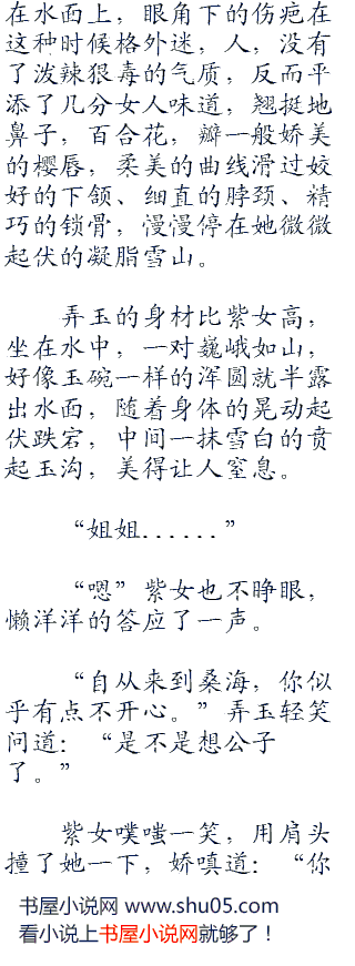 弄玉心中奇怪,嘟着樱唇也把身体沉入水中,挨着紫女闭上眼睛。她很清楚紫女在想什么,和太子同在桑海,却是咫尺天涯,长久的思念,已经让心中万般柔情化成了怨恨。
