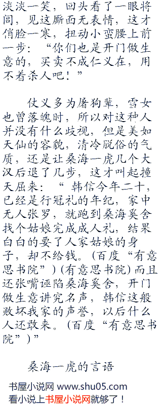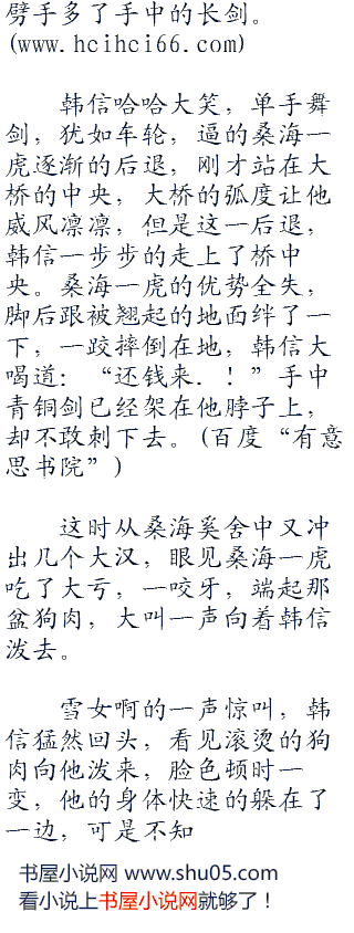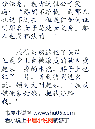 眼看着人越来越多,那个桑海一虎恼羞成怒,拔出腰间的青铜剑,指着韩信的鼻子道:“小子,竟敢血口喷人,那一块白布上全都是血,不是落红是什么,今天嫖娼不给钱,我桑海一虎有好生之德,把钱付清,从老子裤裆之下钻过去,今天就绕你一命。”