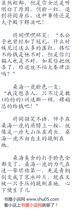 将闾搂住雪女的小蛮腰,笑的差点喘不过起来,从来就没想过,千古名将也有落魄时,竟然找个娼妓破了处男身,还弄出了血崩。