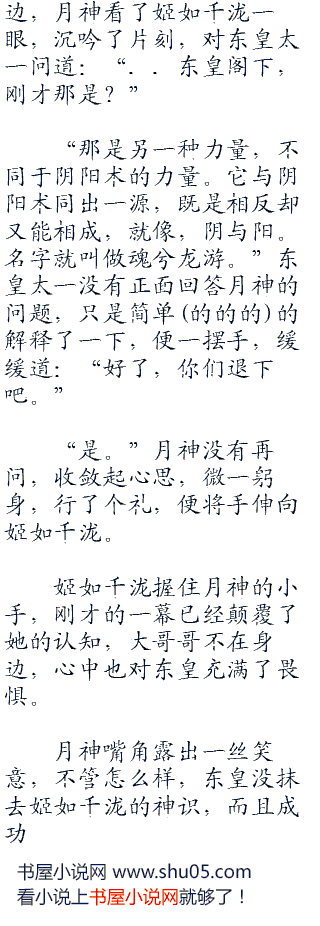 “姬如千泷才是你真正的名字。”随着东皇太一的声音,月儿身前的竹简缓缓翻转,在她面前露出上面的四个古文:“你姓姬,名如,字千泷。”