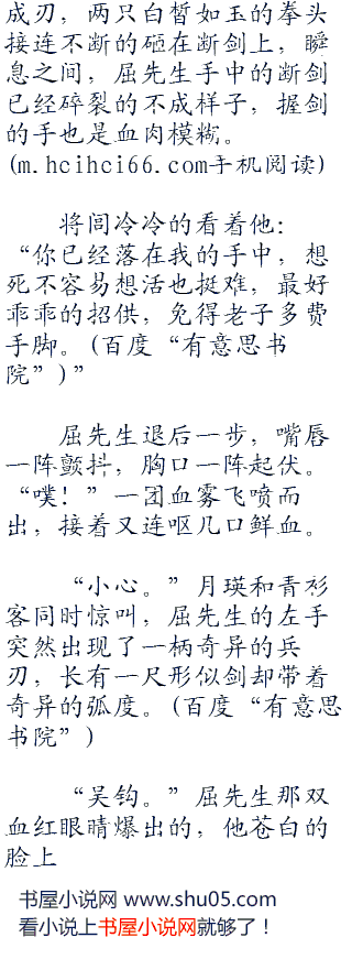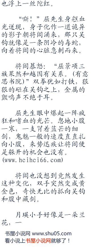“喝”屈先生手中的断剑只剩下一尺多长,依然挥舞着断剑向着将闾攻来,招招凶残只求同归于尽。