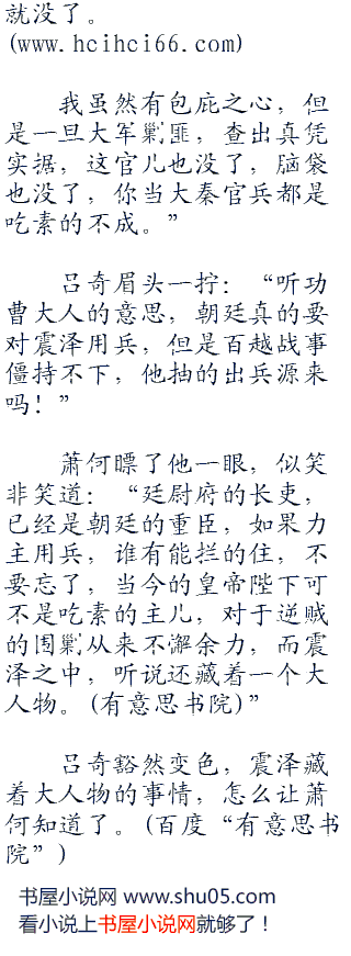 萧何微微一笑,抚须道:“大公子,当着明人何必说暗话,廷尉府的长吏在震泽遇险,官府肯定要追查到底,吕家一旦牵扯进去,就是灭族之祸。”