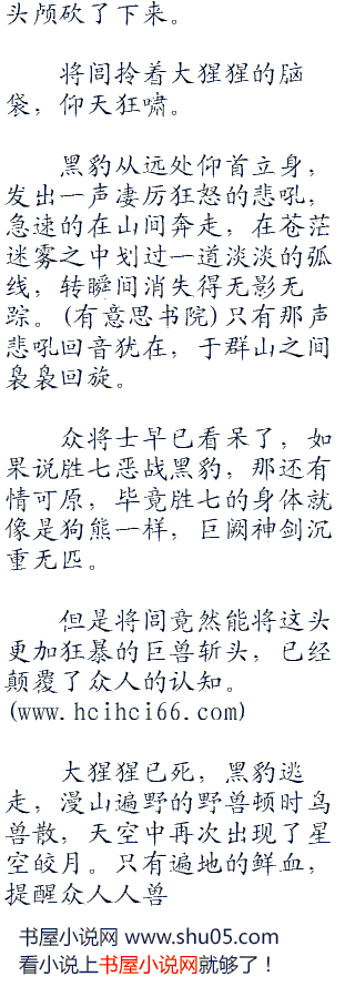 将闾很清楚,这已经是小虞最后的攻击手段,只要将这只庞然巨兽斩杀,所有的野兽就是退避,除了那头黑豹是小虞饲养的之外,院外的饿狼凶虎全都是这头大猩猩驱赶来的。