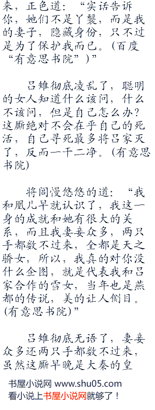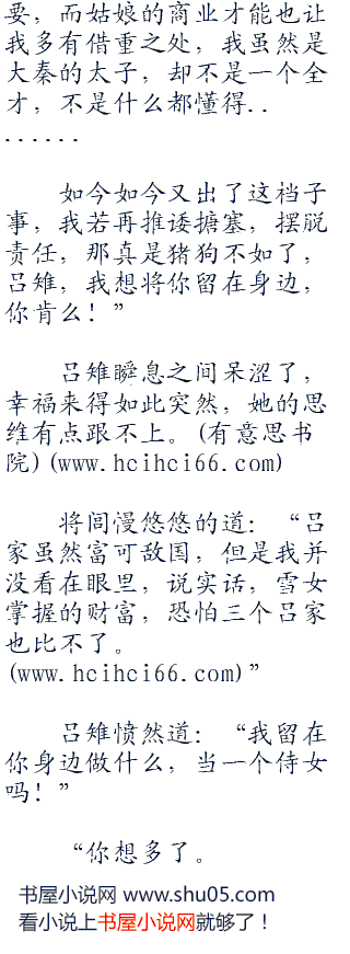 将闾鄙夷一笑:“看了两眼你的身体,你就要死,你看不起我身边的丫鬟,你可知道,穿绿“二三零”裙的那个是神隐一族的族长,穿红裙的那个身份更是贵不可言,你只不过是一个商贾之女,就是祖上当过秦国的宰相,跟她们比起来差远了。”