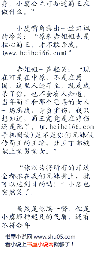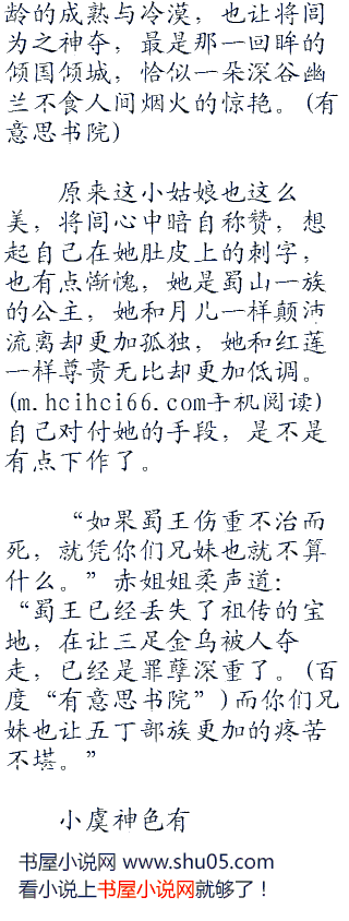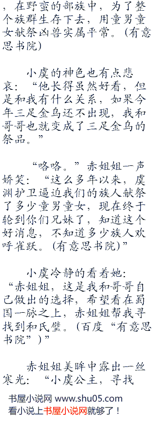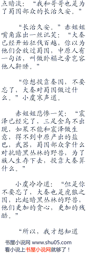 “为了蜀国部众能在暗黑森林生存下去,我也只能牺牲自己了,总比眼睁睁的看着族群每年选拔童男童喂食三足金乌的好。”赤姐姐声音一变,悲惨的声音变得荡气回肠,带着几丝魅惑:“听说那个少年公子长得英俊的很啊!小虞没有用蛇蛊术杀了他,难道舍不得,也对啊!中原的少年长得本来就比蜀国部众俊俏。难道你也想留在中原。”