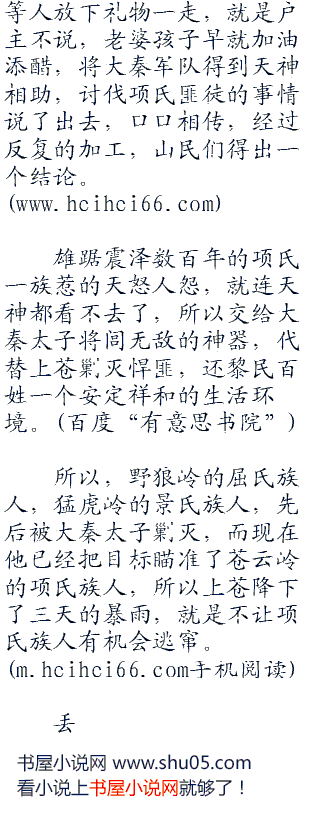 一面大谈大秦将士的勇敢,尤其是大秦太子将闾,手持轩辕神剑,驾驭兵魔神,征战七国战无不胜攻无不克的战绩加大了十倍,就差把这厮夸成神仙下凡了,反复的讲述给这些山民听,让他们劝说投靠项氏一族的族人,朋友,亲戚出山投降。