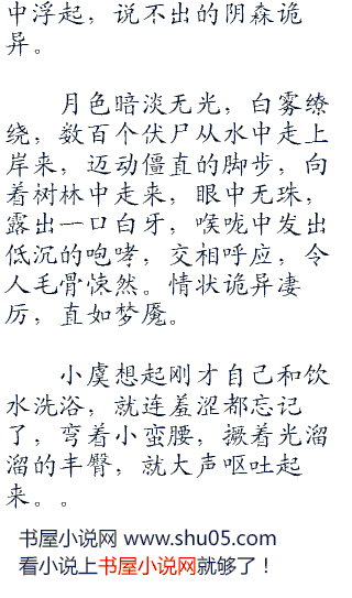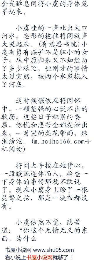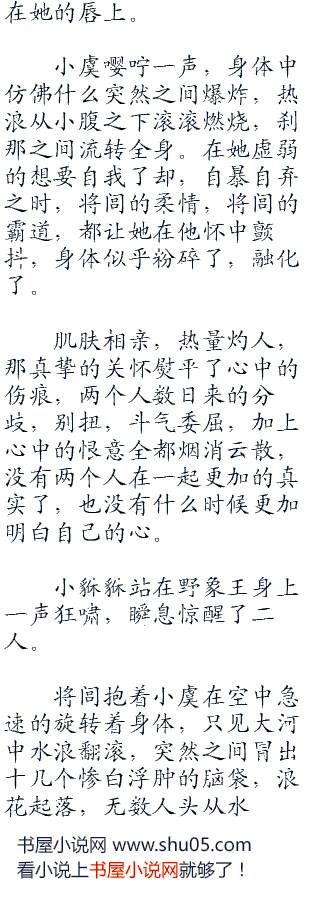 小虞站在冰冷的河水中,望着远处坐在野象王背上的将闾,心中更加的孤单凄凉,泪水又忍不住的涌了出来,无声无息的哭了片刻,才慢慢的擦洗自己的身体。