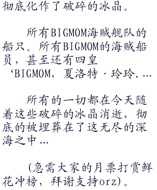 凶狠的目光一扫周围深海之中不断被刹那摧毁的海贼舰队船只,深知自己已经别无它路的夏洛特·玲玲大嘴牙齿一咬,顿时下了狠心。