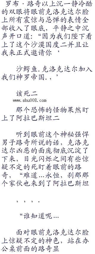 只见王下七武海之一的.沙鳄鱼,克洛克达尔此刻正睁大了自己的双眼,死死的盯着眼前这个自称来自神罗帝国的神秘强悍男子,就连嘴里的大雪茄已经快要烫着嘴唇了都未察觉。