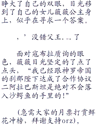 只见这个身穿国王华贵服饰,身材高大长着黑色络腮胡气魄非凡的中年男子,回头焦急的对着薇薇公主大声吼道:‘这个国家已经无可挽回了!我绝对不能再失去你这个女儿了!!”.