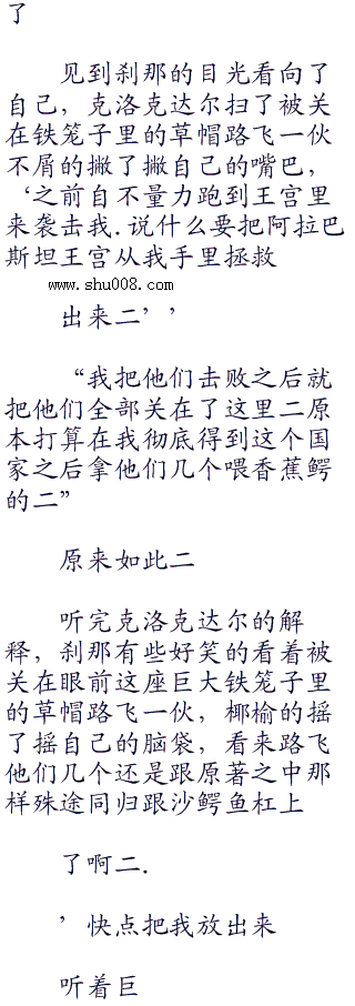 只听见有些熟悉的声音传来,刚刚走入偏殿刹那他们就看见了大殿之中一个巨大的黑色铁笼,里面赫然正关着草帽路飞,山治还有乌索普,甚至还有一个会说人话的驯鹿乔巴。