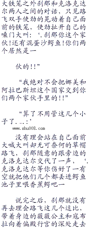 看见刹那一行人走入大殿里之后,原本就一直在铁笼子里大喊大叫的路飞见到了刹那,顿时双手死死抓住了铁笼,嘴巴张开比自己的脑袋还大,‘件巴娜美换给我们!快点放我们出去!!”
