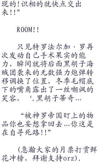 电话虫那头的罗稍微停顿了一下,继续说道:‘.我用手术果实的能力抢先拿到了这两颗恶魔果实二但是黑胡子海贼团一直在我们后面紧追不舍.阮.,.