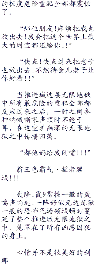 深海大监狱推进城最底层第六层无限地狱里,到处都是一间间分隔开的宽敞巨大监牢。