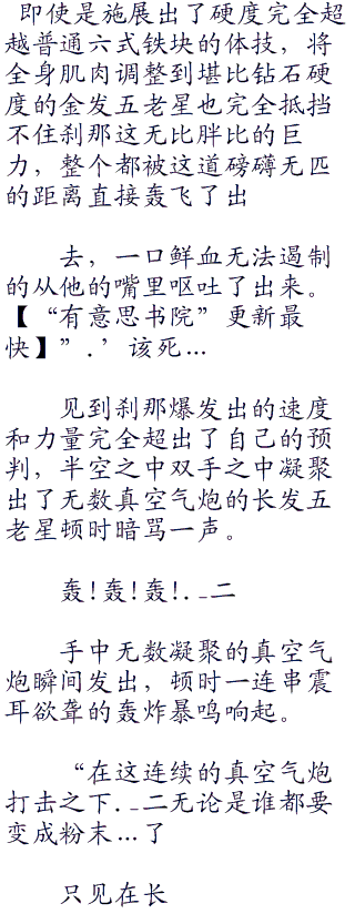 含恨出手的金发五老星赫然瞬间进入了六式奥义生命归还的状态,能够自由的控制自己的身体头发甚至内脏,把意识灌进身体之后,自由控制自己全身上下的任何地方。有▲意▲思▲书▲院