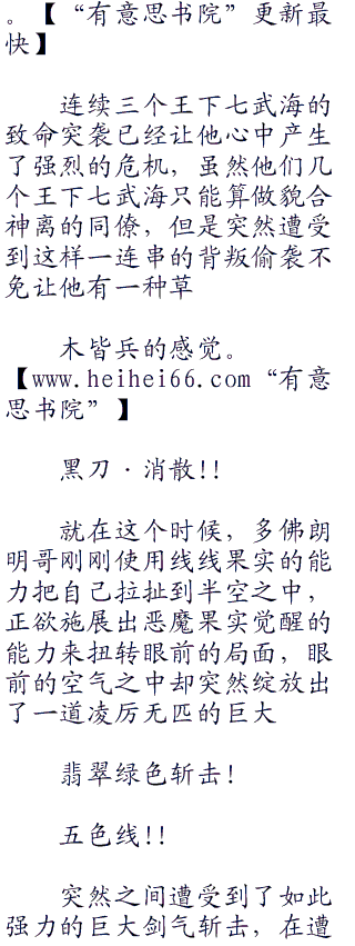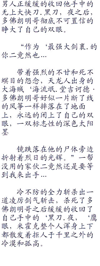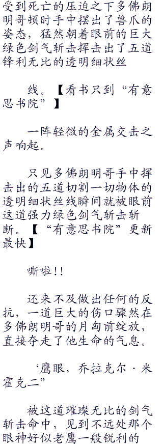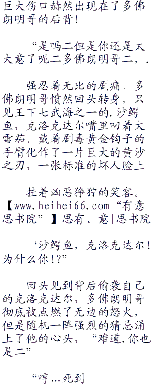 忽然之间多佛朗明哥背后无尽黄沙飞舞,骤然形成了一柄巨大的沙之刃,挟带着斩开整个大地的强劲力量猛然朝着他的背后斩杀而至!