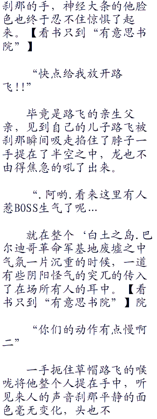 “路飞!!’看见路飞瞬间被刹那整个人吸走,一只手掐住脖子提到了空中,除了草帽海贼团的众人之外另外一边的龙和萨博也顿时惊呼道。
