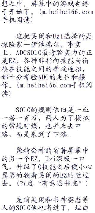在吴闲发出SOLO的字样后,Uzi也没有丝毫惫外的答应了。事实上他也没办法不答应,如果是一个实力比Uzi差许多的ADC向Uzi提出SOLO的要求,Uzi不答应那是情理之中的事情,众人也不会说什么。