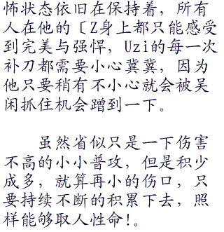 不过补刀数虽然一样,但在血量上,由于吴闲开局让了Uzi三个Q技能的关系,所以还是Uzi要占据着些许优势的。