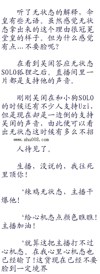 而现在,在UziSOLO输给吴闲之后,无状态感觉自己的机会来了,只要他能在SOLO里击败吴闲,那么就能进一步稳固他在队内’隐形队
