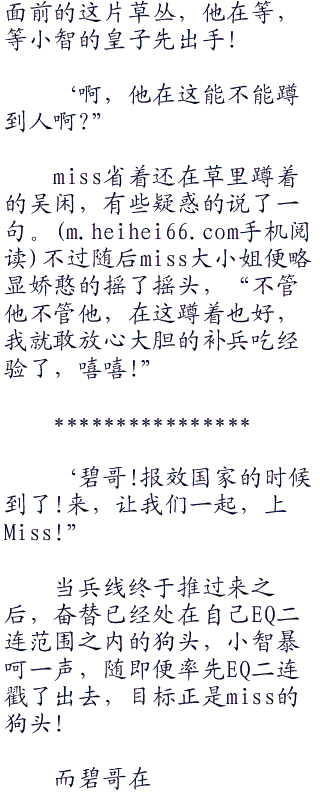 说完之后,碧哥便控制着猴子推起兵线来,而小智在兵线稍微推过去,已经省不到他的视野的时候,也‘九一三,’控制着皇子蹲进了第二个草丛之内。